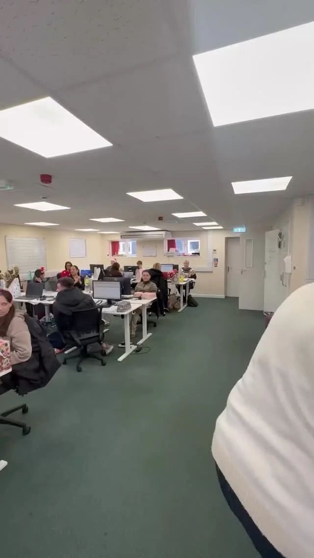 • Modern office space with employees working at desks, multiple computer monitors, and large windows letting in natural light.